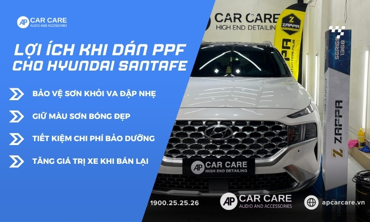 Tóm lại, dán PPF xe Hyundai Santafe giúp bảo vệ toàn diện, duy trì giá trị và vẻ đẹp cho chiếc SUV Hàn Quốc này. Nếu bạn đang tìm dịch vụ dán PPF xe Hyundai Santafe TPHCM chất lượng, hãy liên hệ AP Car Care qua hotline 1900.25.25.26 để được tư vấn miễn phí và ưu đãi hấp dẫn.