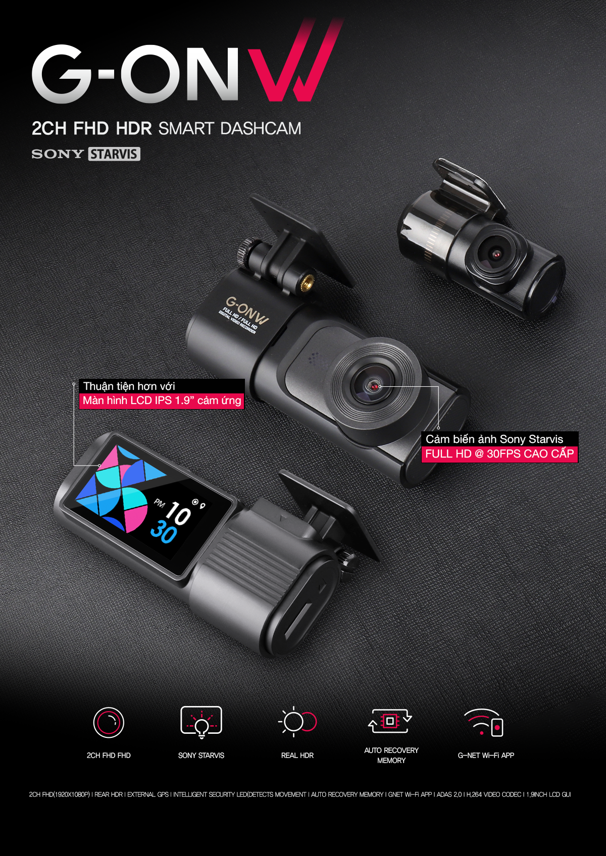 GNET G-ON W có thiết kế nhỏ gọn, hiện đại, dễ dàng lắp đặt mà không ảnh hưởng đến tầm nhìn của tài xế. Sản phẩm bao gồm hai camera trước và sau, ghi hình ở độ phân giải Full HD 1080p siêu sắc nét.