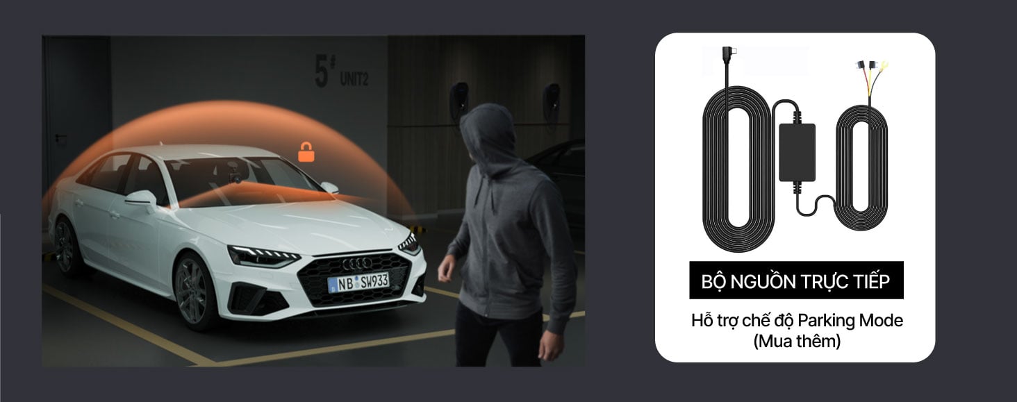 Chế độ ghi hình đỗ xe (Parking Mode): Camera tự động giám sát và ghi lại mọi va chạm hoặc tác động xảy ra khi xe tắt máy.