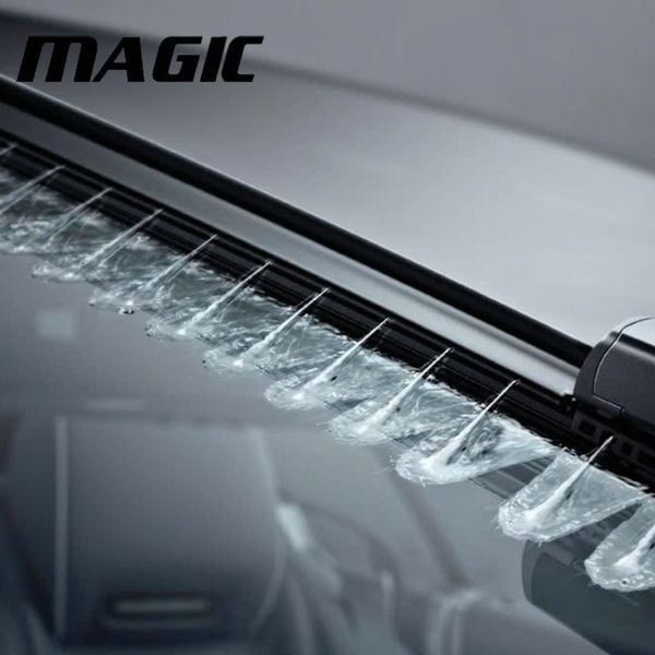 - Phun tia nước thành hàng ngang: Thay vì phun loang lổ từ một điểm, hệ thống phun của Wiper Magic phủ đều một dải nước mỏng lên mặt kính. Điều này giúp làm mềm bụi bẩn và làm sạch kính triệt để ngay từ đầu.