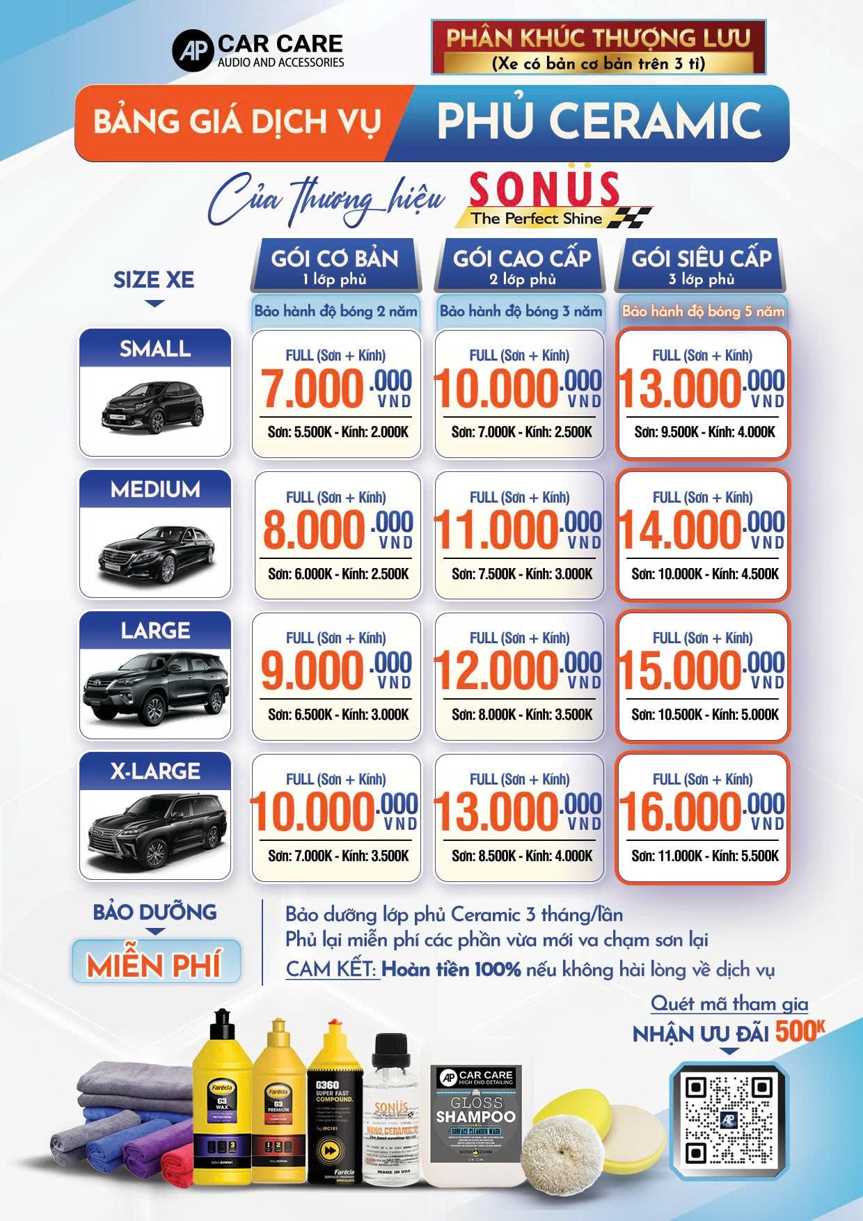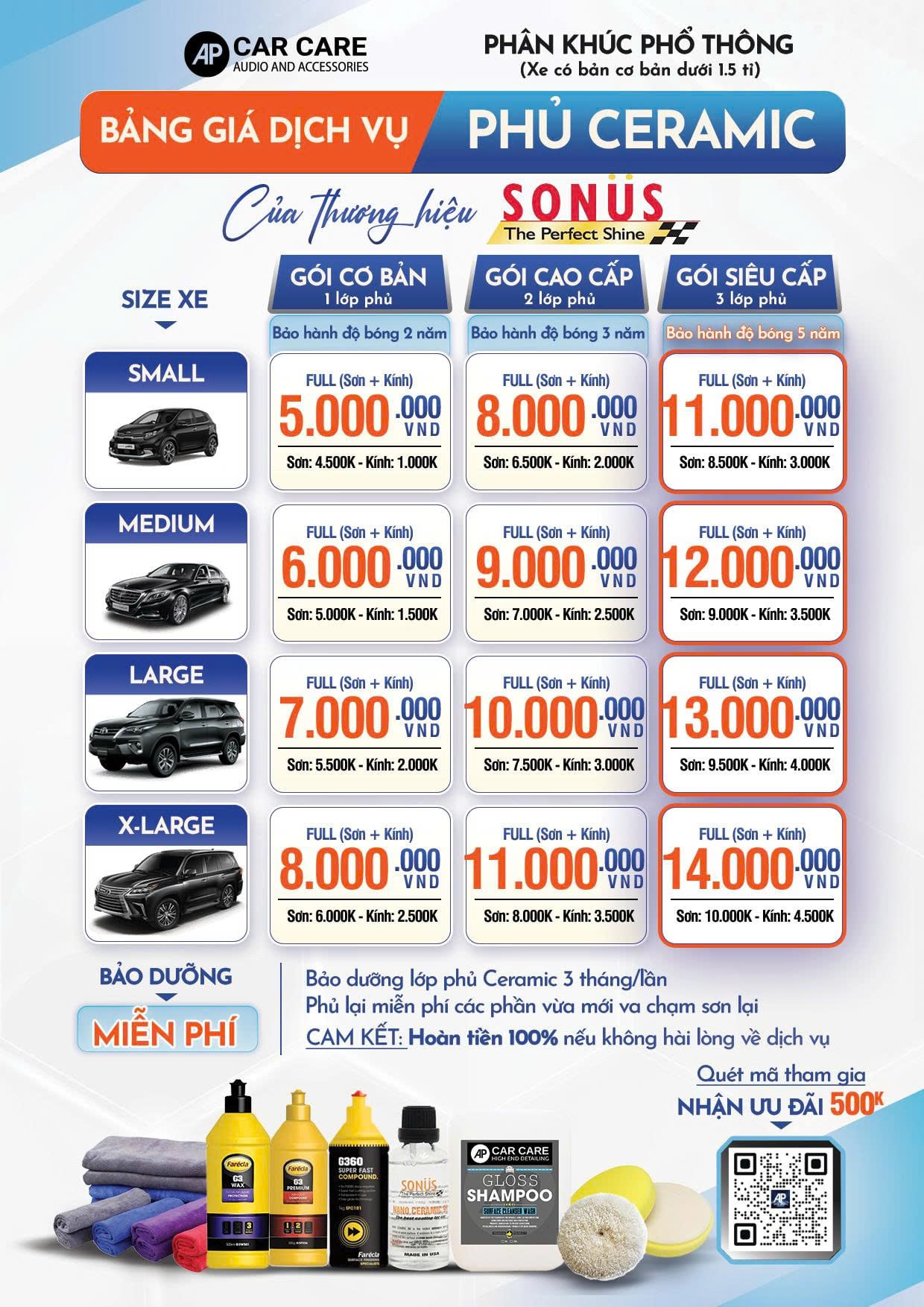 – Chọn gói nào, giá phủ ceramic ô tô bao nhiêu phụ thuộc vào túi tiền và môi trường sử dụng xe của bạn. Dĩ nhiên phủ càng nhiều lớp thì xe càng bóng, bảo vệ càng tốt và độ bền cũng gia tăng theo. Đồng thời mức giá phủ ceramic ô tô cho từng size xe cũng sẽ khác nhau.